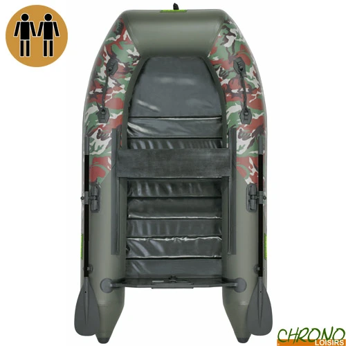 ExtrĂȘmement stable, il bĂ©nĂ©ficie d’une banquette rĂ©glable, d’un plancher Ă lattes, d’une attache inox sur la proue, de deux poignĂ©es de type « corde » sur l’avant, de dames de nage robustes, d’une planche arriĂšre avec support moteur renforcĂ© et d’une superbe finition olive green/camou du plus bel effet.